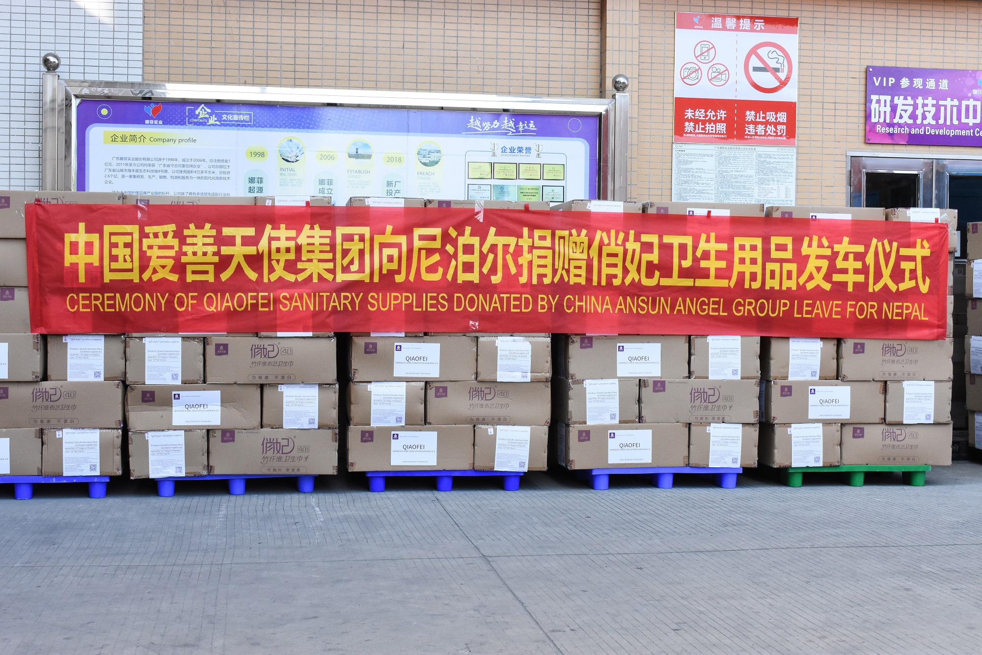 为践行“一带一路”倡议,促进中尼友好关系。2019年12月5日,爱善天使集团与联合国人口基金驻华代表处、中国生殖健康产业协会三方签署了向尼泊尔和津巴布韦两国捐赠价值近240万元人民币俏妃竹纤维卫生巾的意向书。但因新冠疫情的影响,此次捐赠直到如今才正式发车。