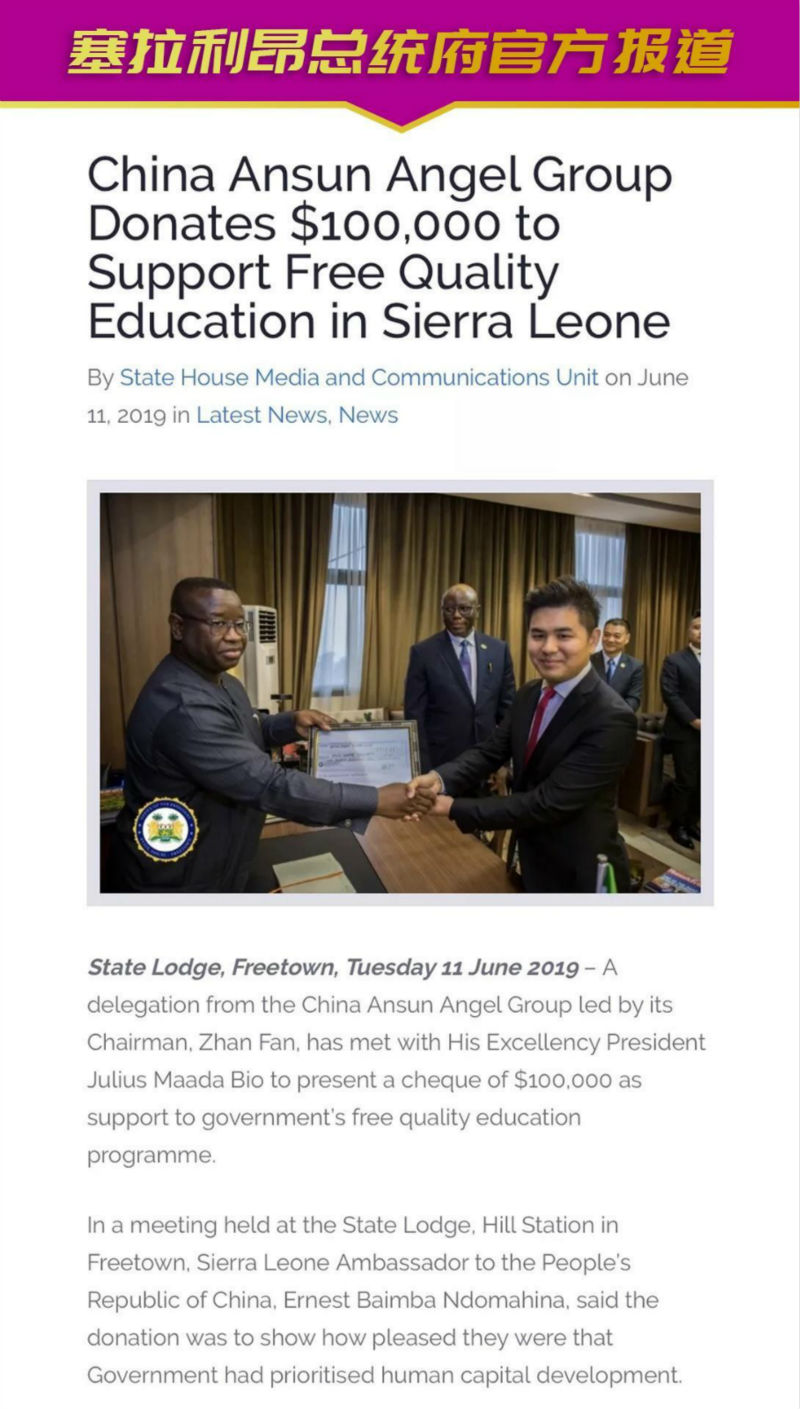 爱善天使集团创始人张帆对总统阁下以及大使的邀请表达了感谢,他表示,很荣幸能够为塞拉利昂的教育事业出一份力,而投资教育是促进国家经济发展的最正确的步骤,未来可以有机会继续为塞拉利昂的妇女儿童事业继续贡献力量,为中非关系继续友好发展贡献力量。